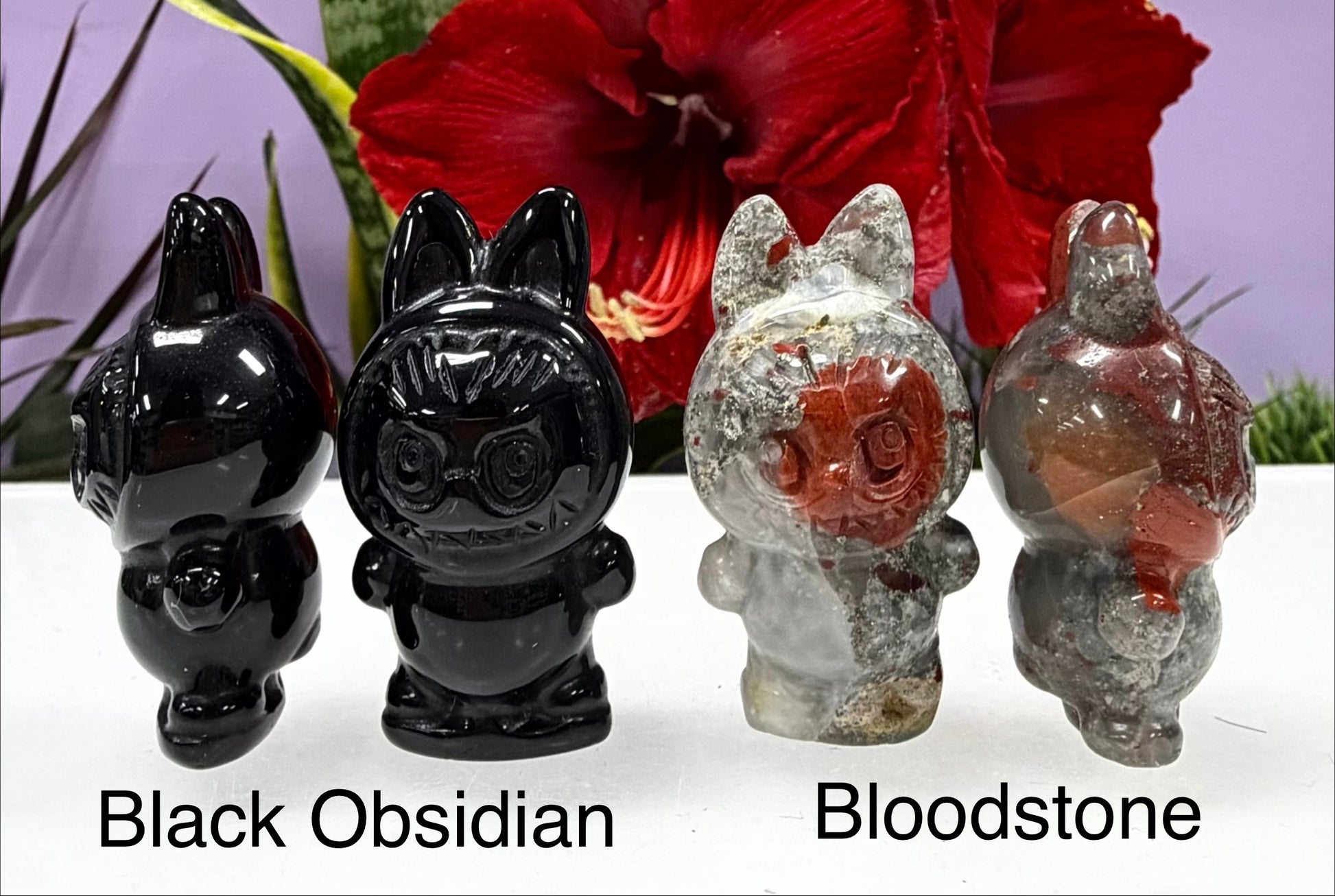 This wholesale set includes 6 hand-carved and polished crystal Gremlin Monster Lafufu. You will receive one of each: Tiger Eye, Rose Quartz, Black Obsidian, Aventurine, Bloodstone, and Clear Quartz. Condition is New.
