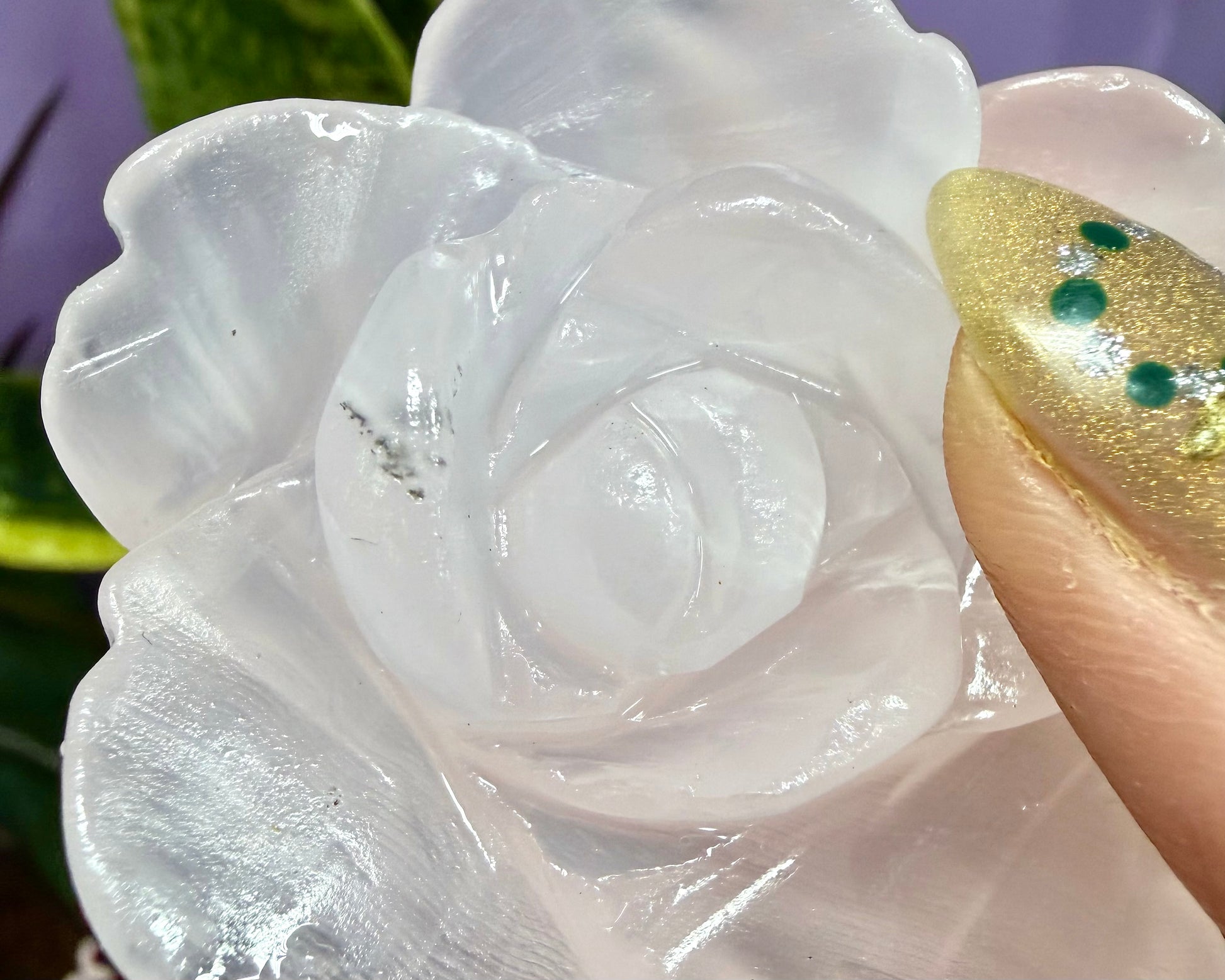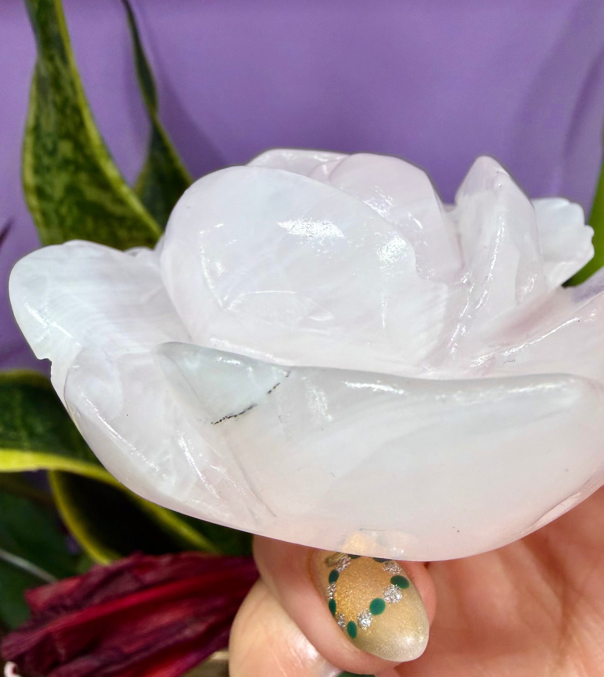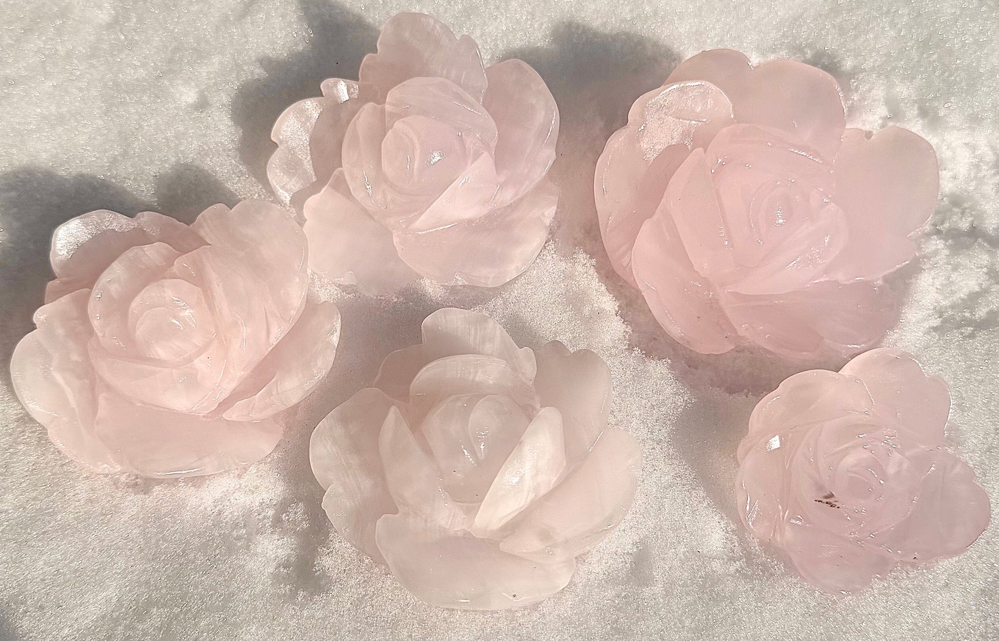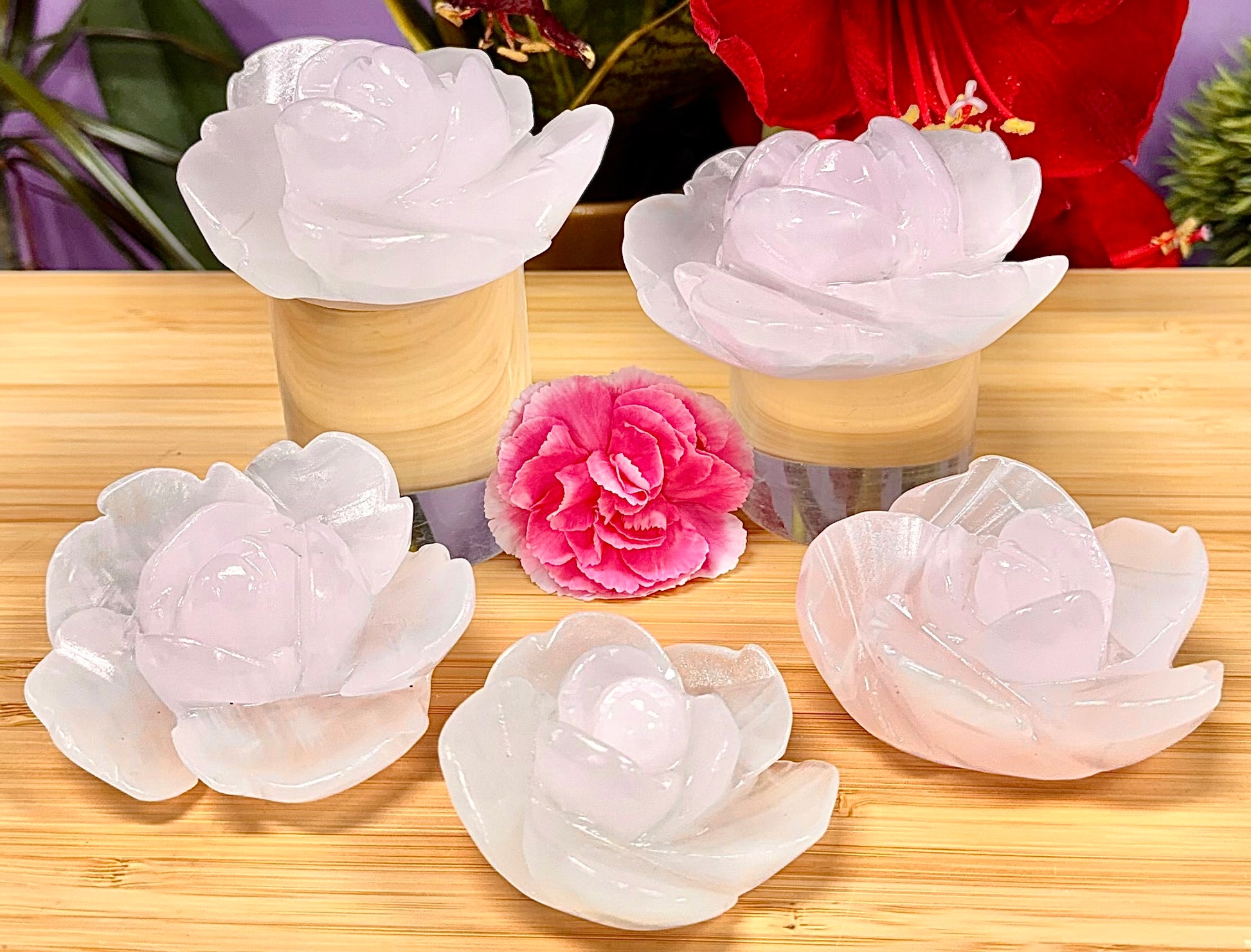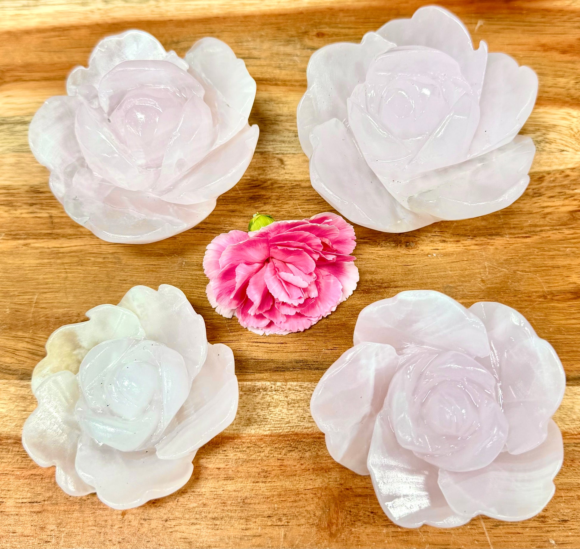 Each flower is hand carved and carefully polished from natural Mangano Calcite. Some pieces may contain natural black mineral inclusions, which are a normal characteristic of the stone and add to the uniqueness of each piece. The total weight per lot is approximately 1.9 to 2 lbs. Condition is new.