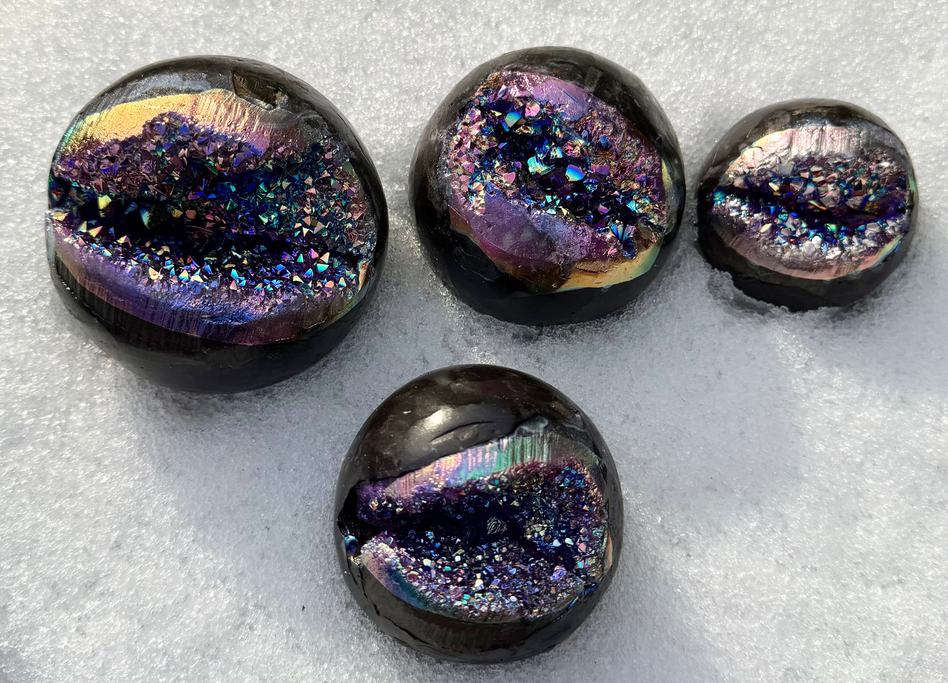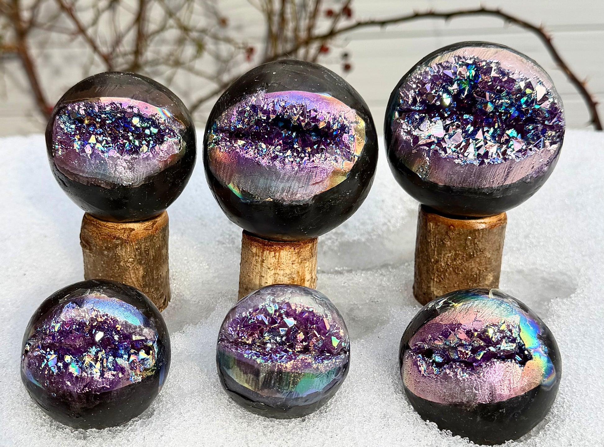 Each sphere is crafted from amethyst with an aura finish, giving it a vibrant, iridescent sheen. The spheres range in size from approximately 50mm to 80mm in diameter. The total weight of each lot is between 3.8 to 4 lbs. All pieces are new and carefully selected.