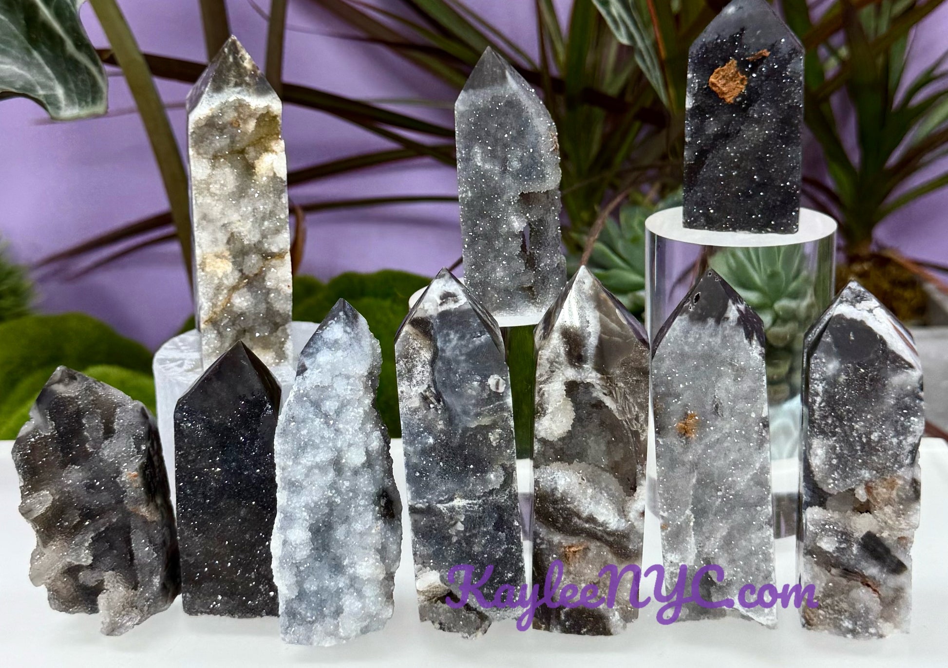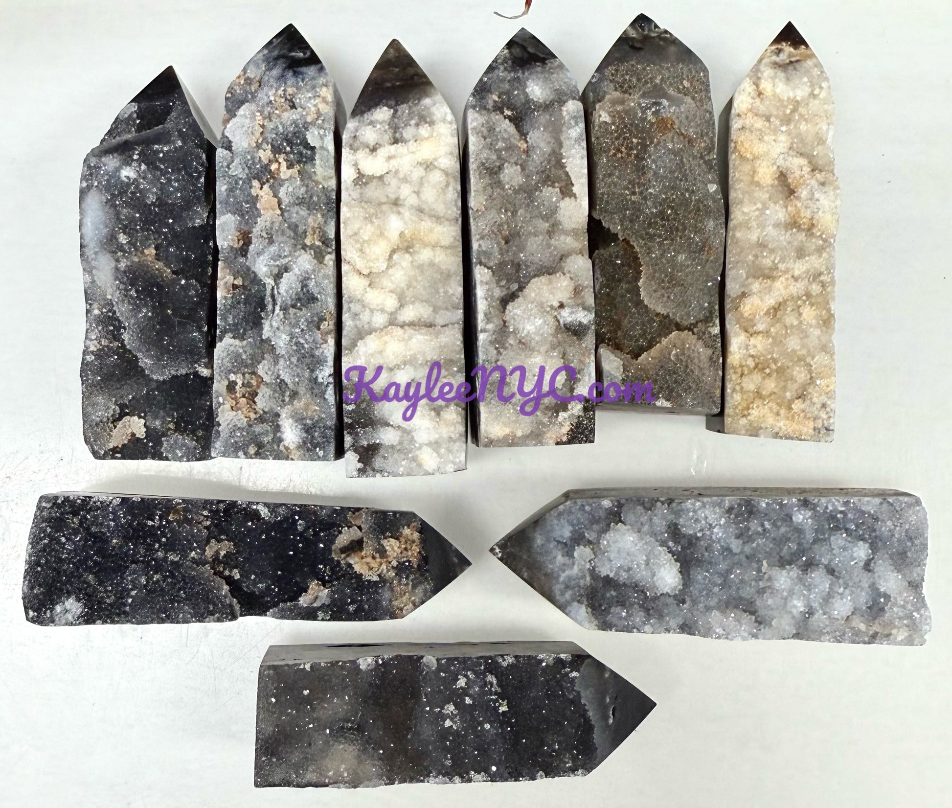 Wholesale Lot 2 lbs Natural Black Chalcedony Sphalerite Obelisk Tower Point Crystal. Range from 2” - 5” in length and 8 to 13 pcs per lot . Condition is New.