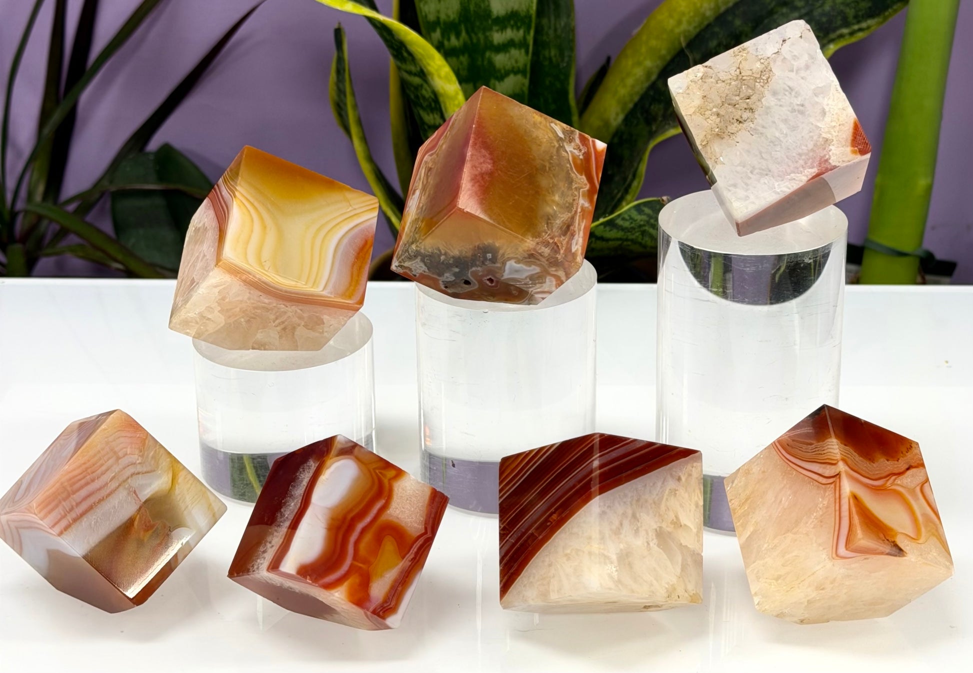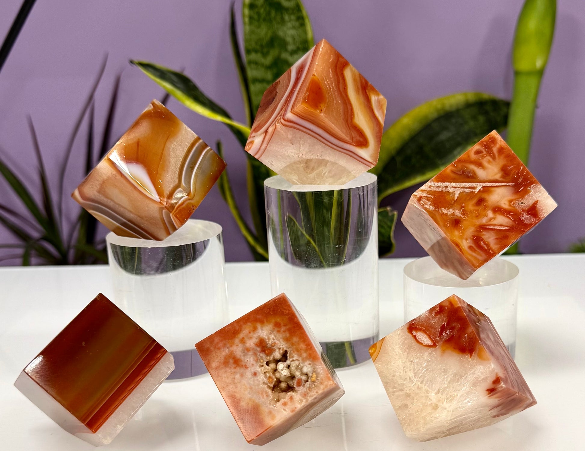 Wholesale lot of 2 lbs Natural Carnelian cube crystals. Each lot includes approximately 6 to 8 pieces. These cubes are made from genuine natural Carnelian and display warm orange to reddish tones with natural variations, making each piece unique. Stones are well-shaped and polished, ideal for collectors, crystal shops, home décor, or metaphysical use. Condition is new.