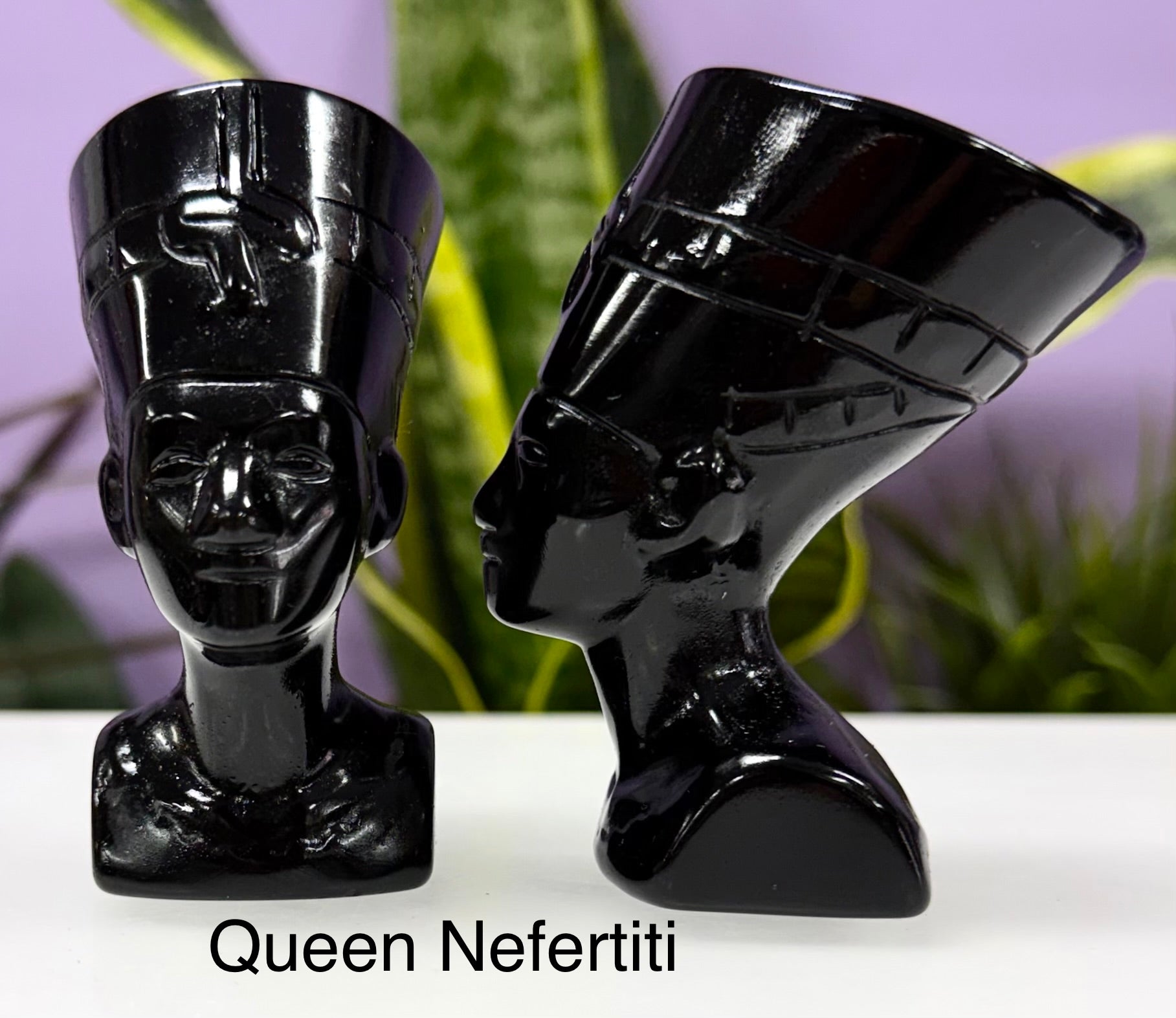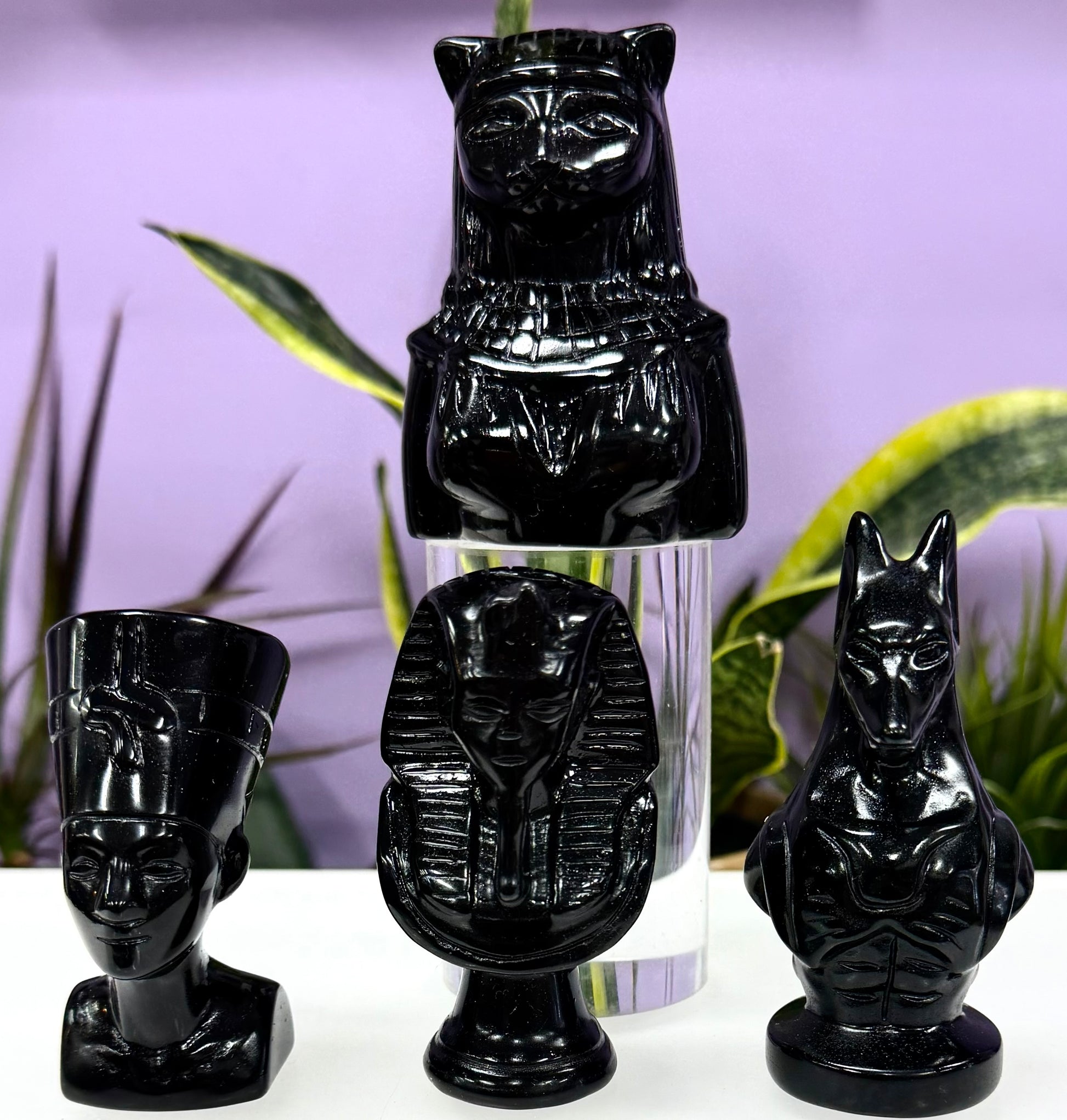 Wholesale lot 4 PCs Natural Black Obsidian Egyptian Carving, they were hand carved and polished, roughly 10cm tall. You will receive 1 King Tut, 1 Queen Nefertiti, 1 Bastet, and 1 Anubis. Condition is New.