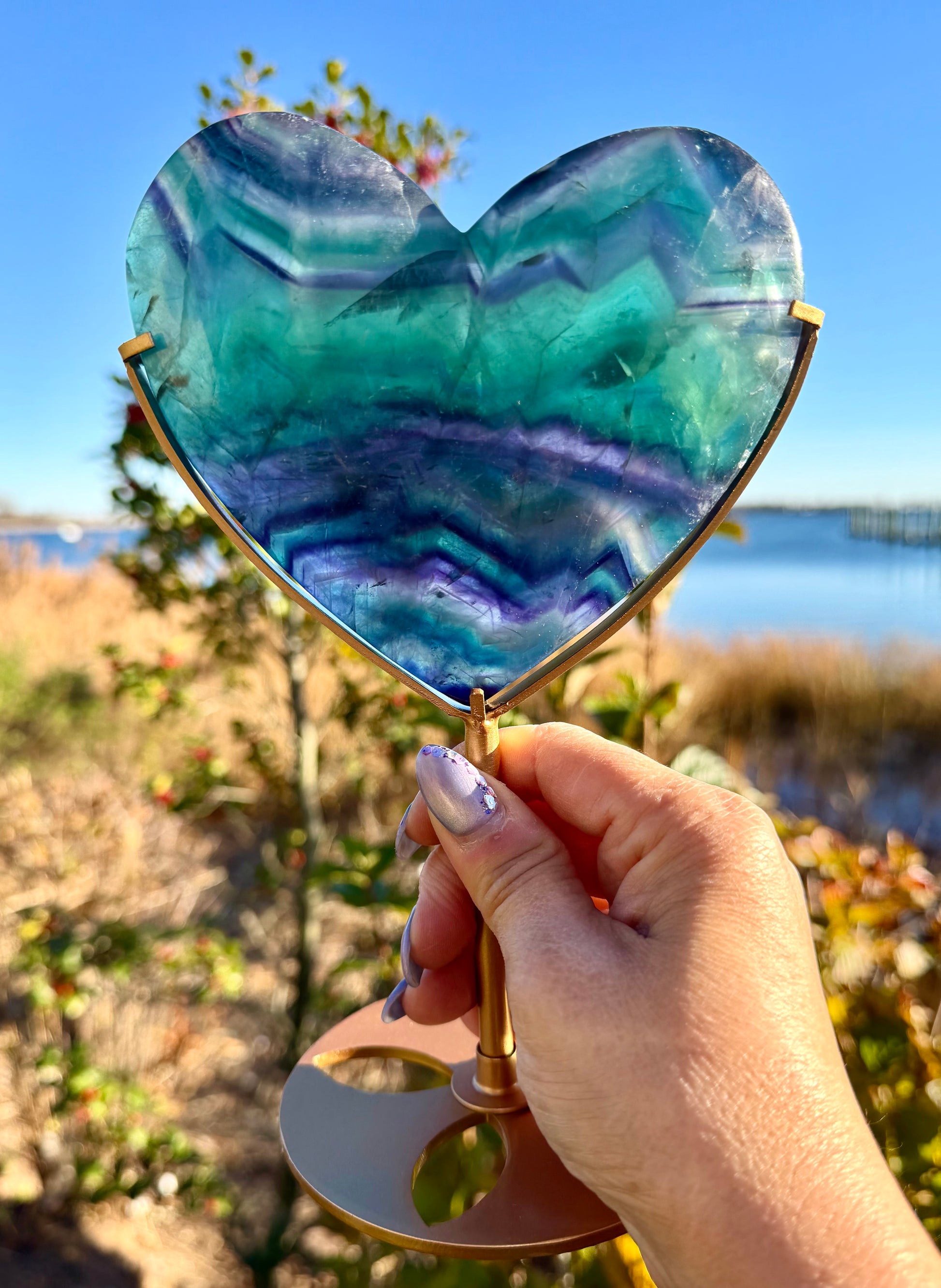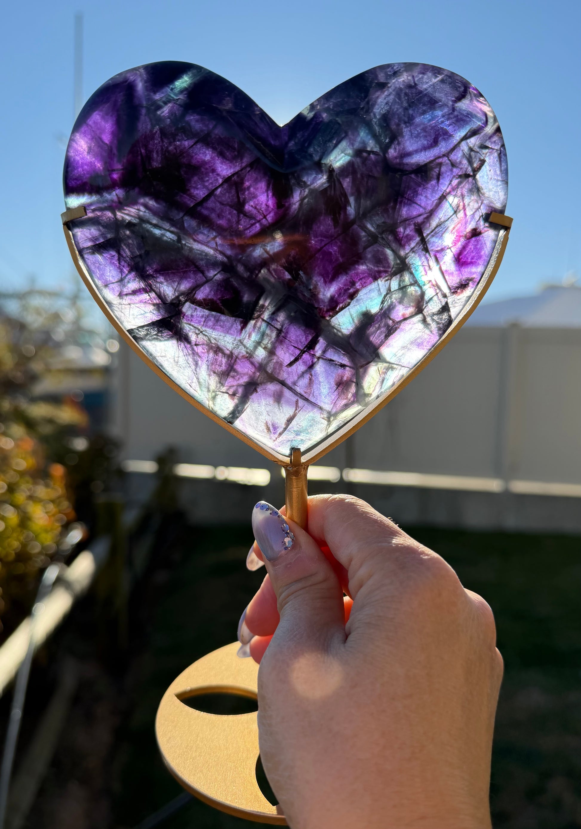 Wholesale lot 3-4 PCs Natural Rainbow Fluorite Heart with stand. they can range from 5.5” to 6.5” tall, total weight is between 5.8 to 6 lbs. Condition is New.