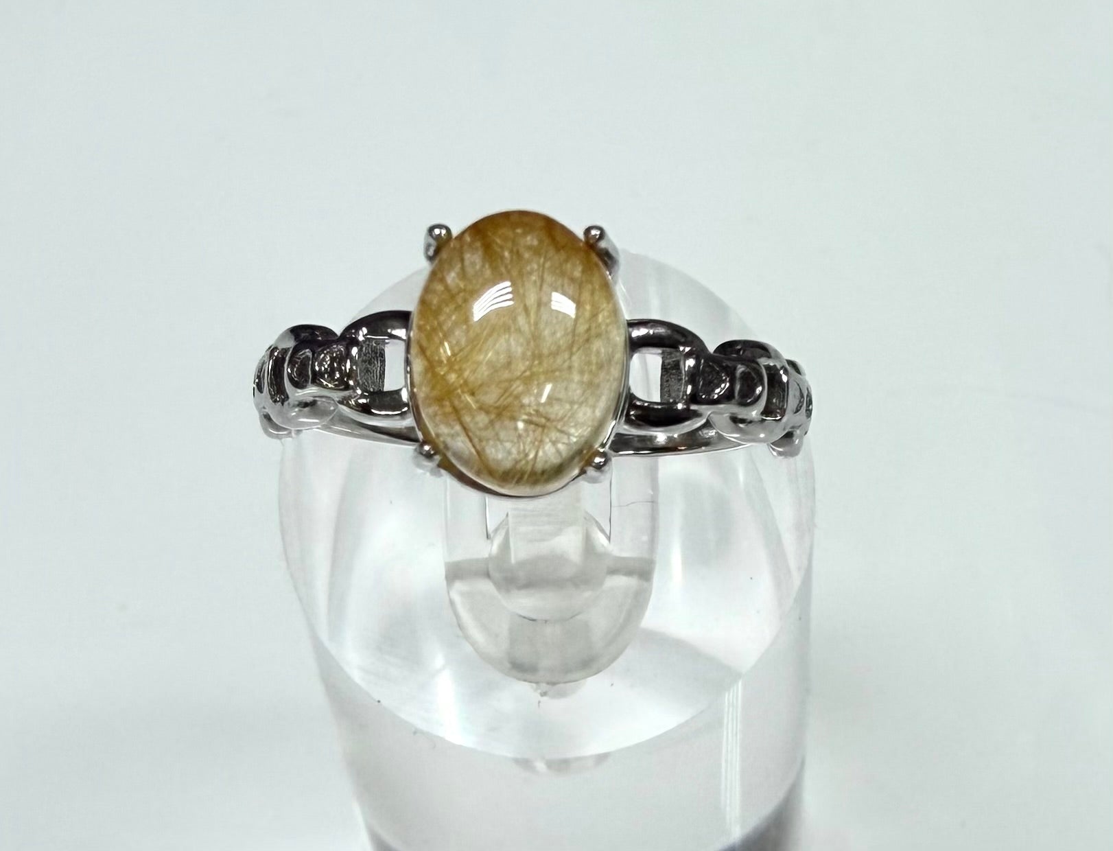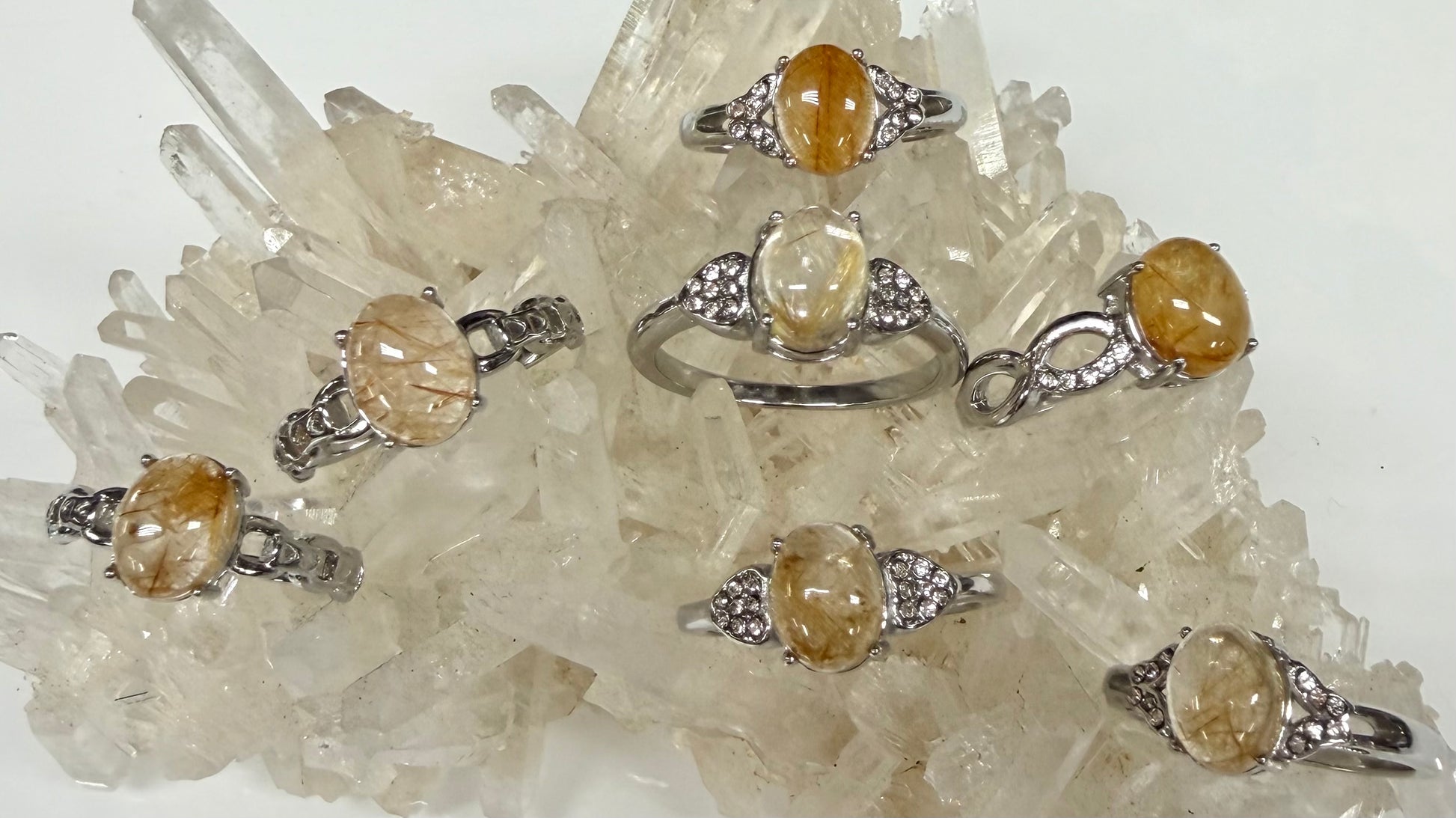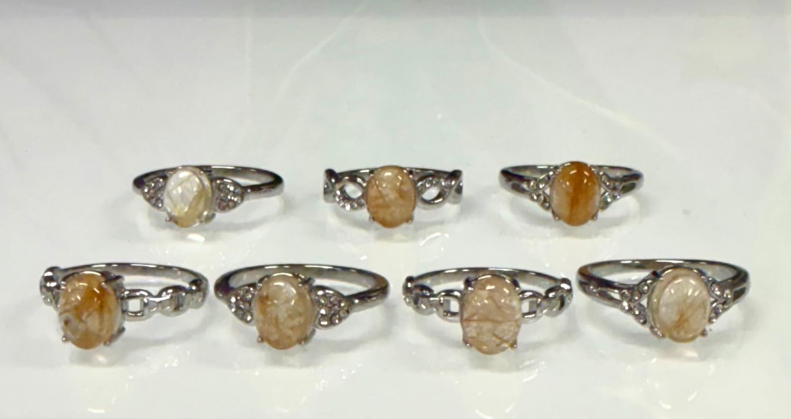 This wholesale lot includes 7 natural Gold Rutilated Quartz rings set in durable 316 stainless steel. The Gold Rutilated Quartz measure approximately 7x9 mm each. You will receive the following sizes: 1 size 6, 2 size 7, 2 size 8, 1 size 9, and 1 size 10.