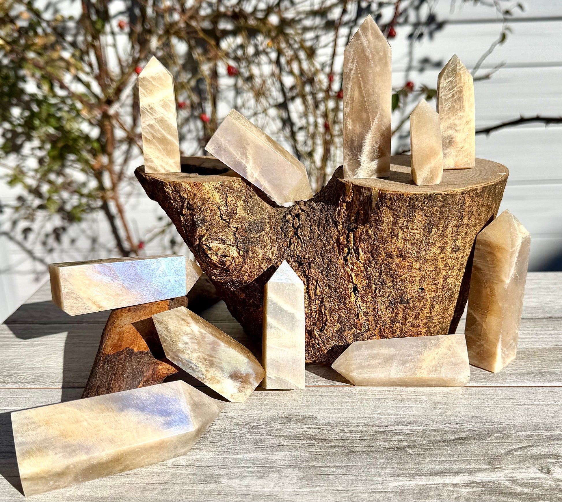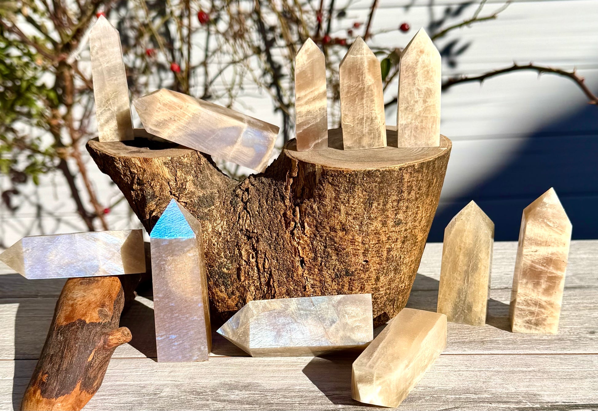 This wholesale lot includes 2 pounds of Natural Moonstone crystal towers, each ranging from 2” to 4” in length. You will receive an estimated 6 to 12 pieces per lot, depending on individual sizes and shapes. Every piece is naturally formed and showcases Moonstone’s signature shimmer and calming energy. Condition is New.